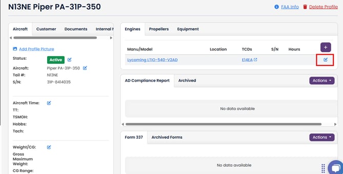 1. To add the location in the Aircraft Profile (recommended), edit the engine or prop by clicking on the blue edit