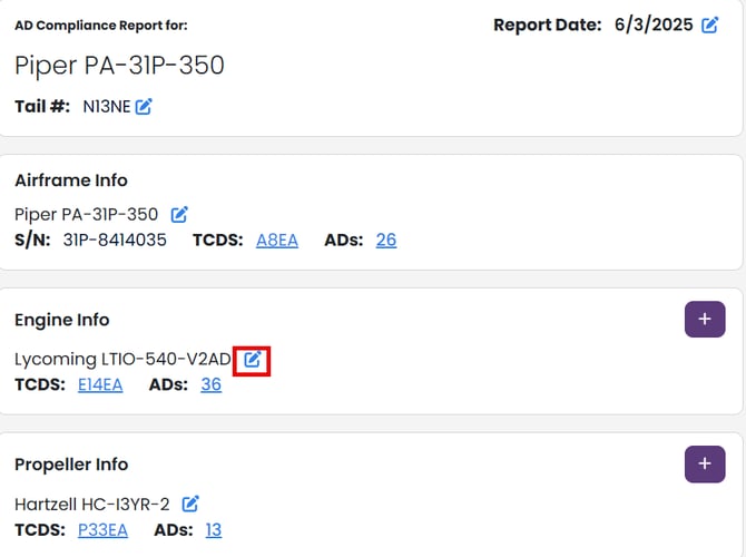 2. To add the engine/prop location directly in an AD Compliance Report, open your AD Report Prep page and then click the blue edit