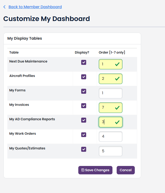 Here, you can deselect tables that you aren't using or update the order of these. For example, you may want to show AD Compliance Reports and Work Orders at the top (by changing them to 1 and 2).
