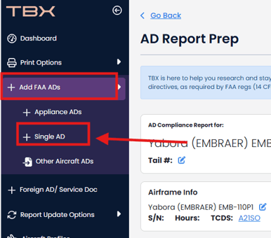 Simply navigate to the left navbar and select "+ Add FAA ADs" and then "Add Single AD":