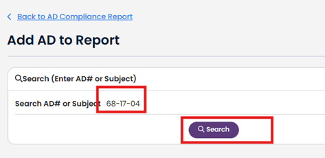 Enter an AD# or subject that you would like to search in the Search box and then click the purple "Search" button.