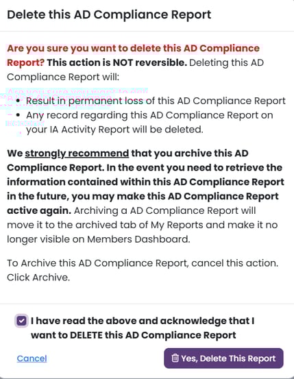The system will prompt you to make sure you want to perform this action with a checkbox acknowledgment. Click "Yes, Delete This Report" if you want to permanently delete the AD Report. Otherwise, select "Cancel".