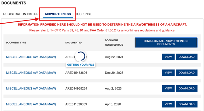 Once you completed the search, click the "Airworthiness" tab to view the available documents for your aircraft.