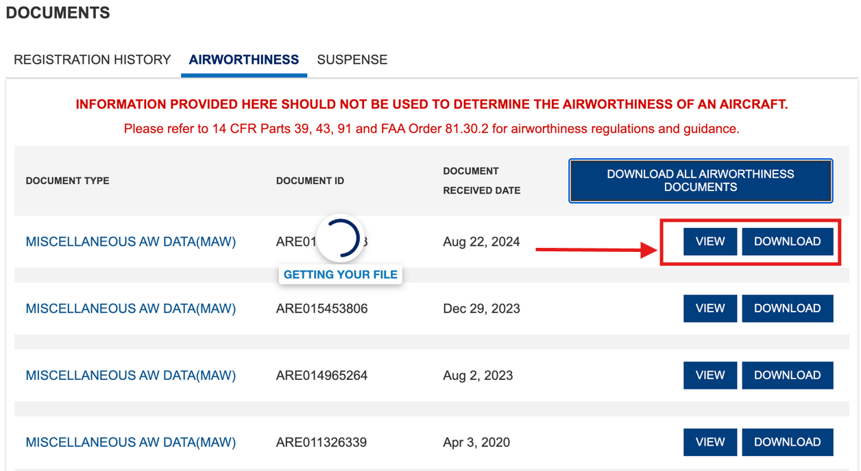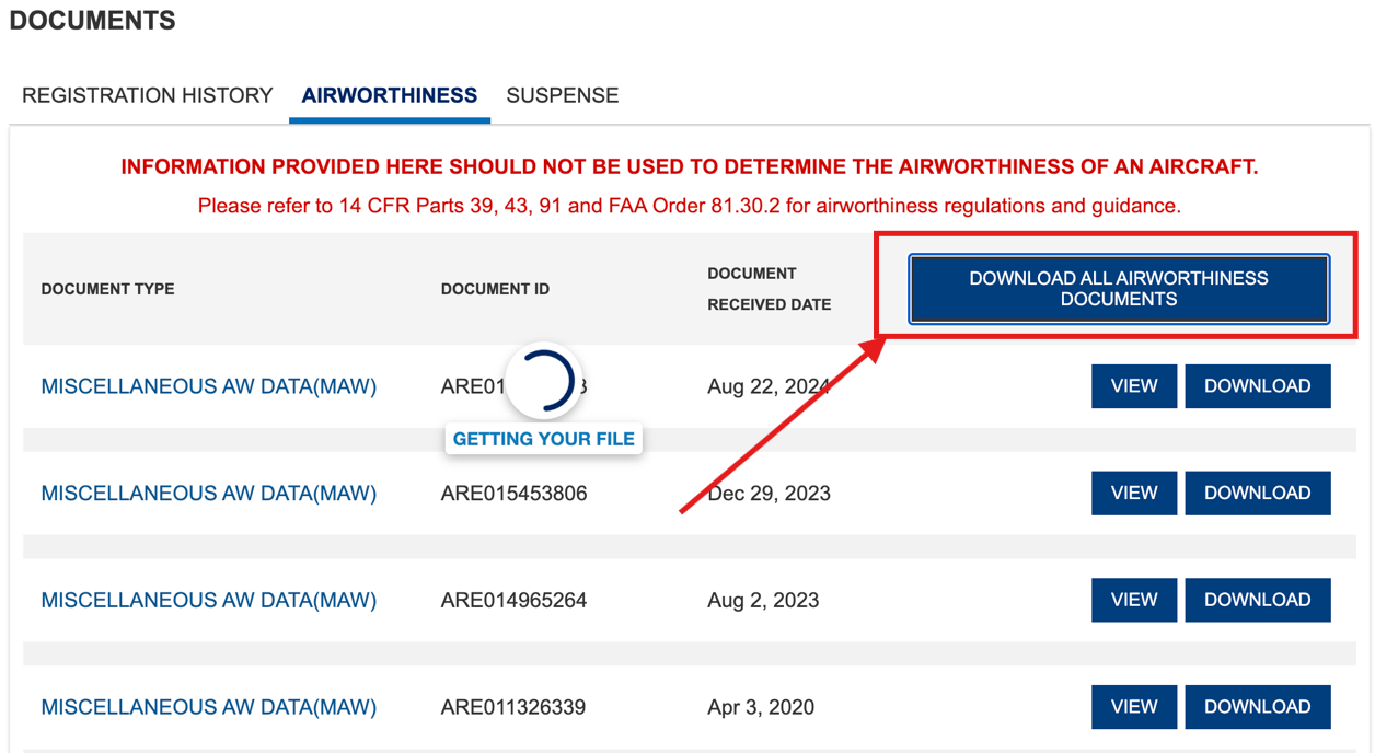 You can also download all the airworthiness documents for an aircraft by clicking the "Download All Airworthiness Documents" button.