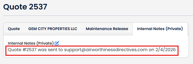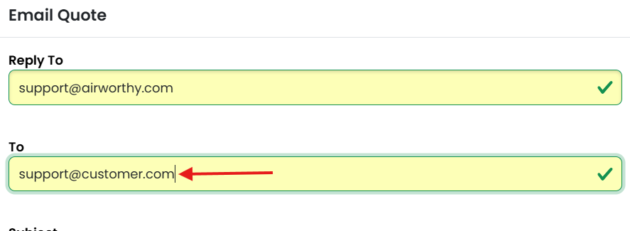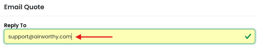 Quotes/Estimates will be emailed from no-reply@airworthy.com but you can us the Reply To field to add an email that your customer can reply to. It will default to the email address of the user logged in.