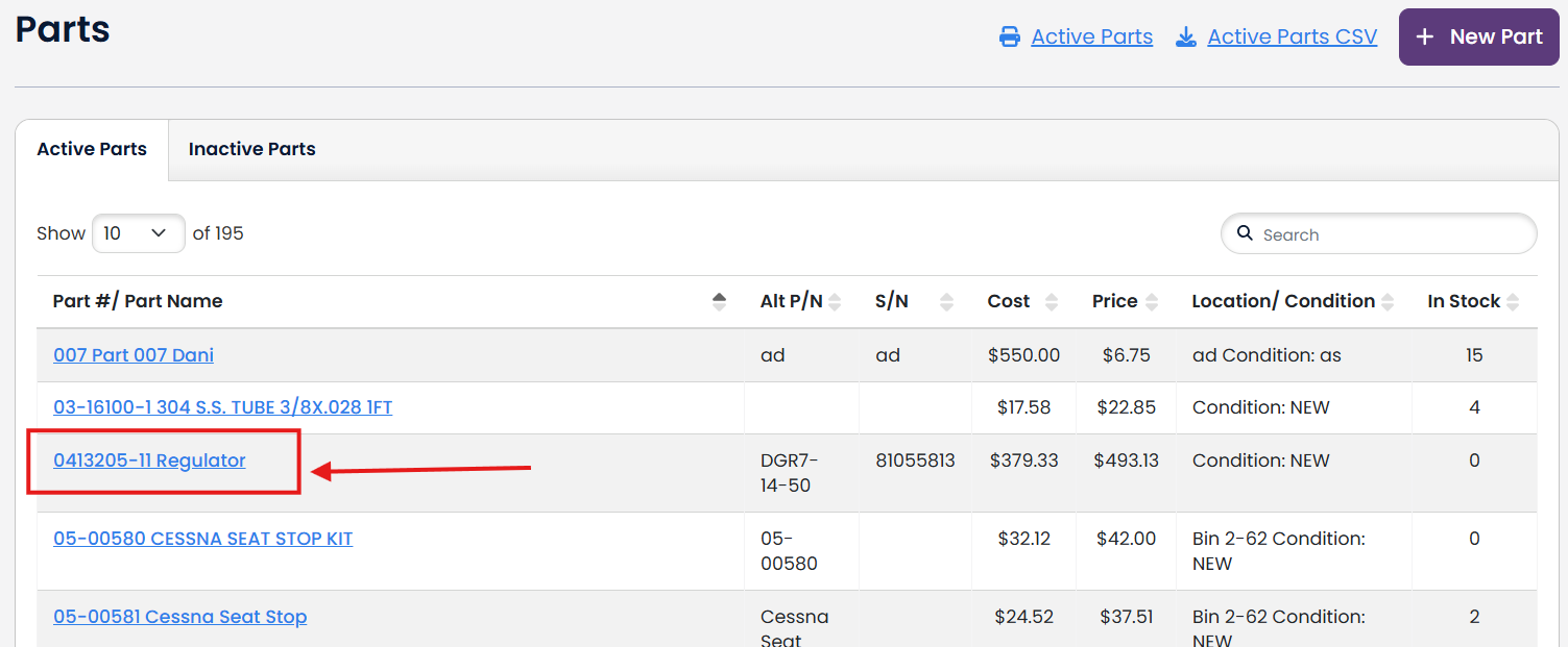 Click on the Part#/ Part Name link from either the active or inactive parts lists.