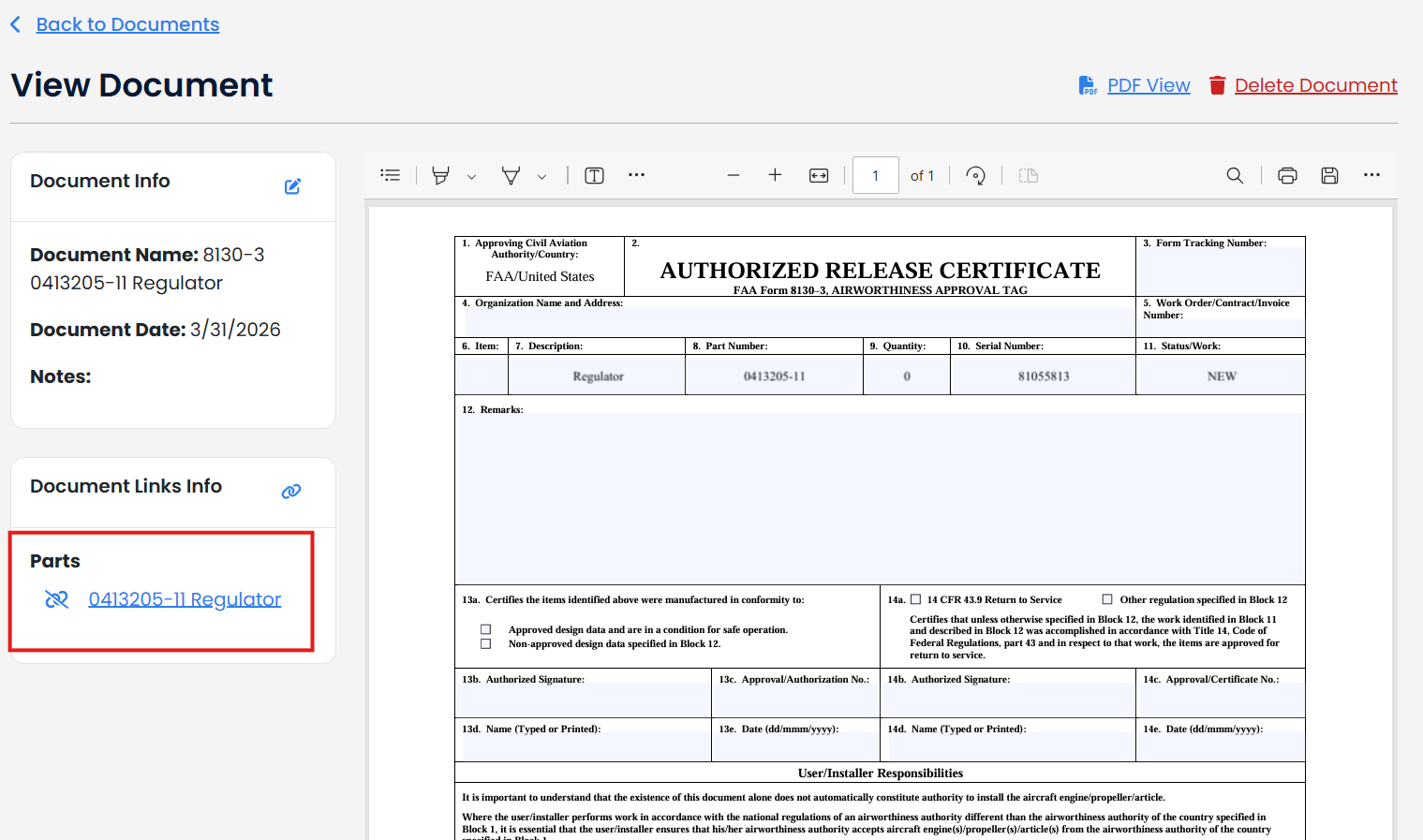 The document will be saved to your Documents and linked to your part. You will be returned to the View Document page.