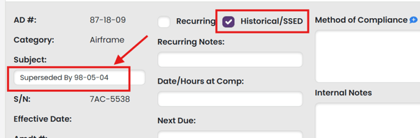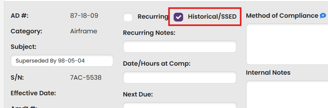 In your AD Compliance Report, there is a check box available for all ADs in your report to mark ADs as "Historical/SSED".