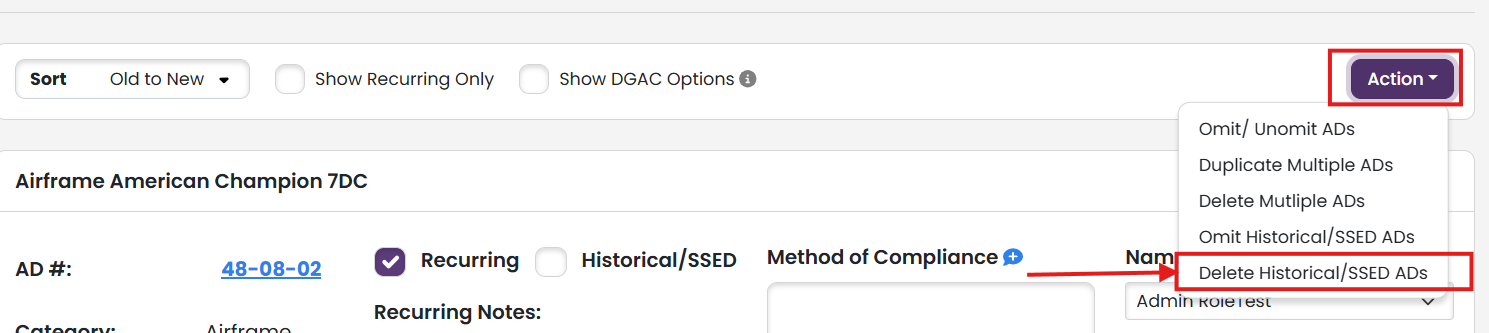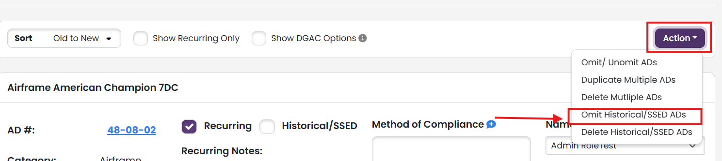 - Want to keep the complete and traceable history of your aircraft, but don't want the historical ADs to print? You can omit the historical ADs from your AD Compliance Report with a few easy clicks. Under the Action dropdown, select "Omit Historical/SSED ADs".