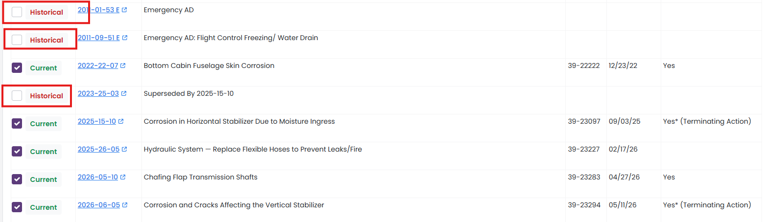 When updating you AD Compliance Report, the AD list will include historical ADs. They are unchecked by default.