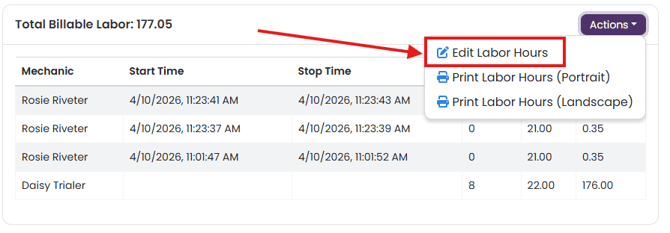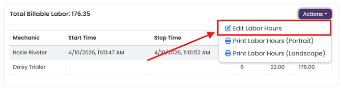 To edit this information, click on the Actions button, and click Edit Labor Hours