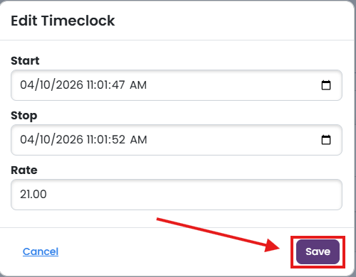 - Make sure your Rate is set. Then simply press Clock In to start the timeclock