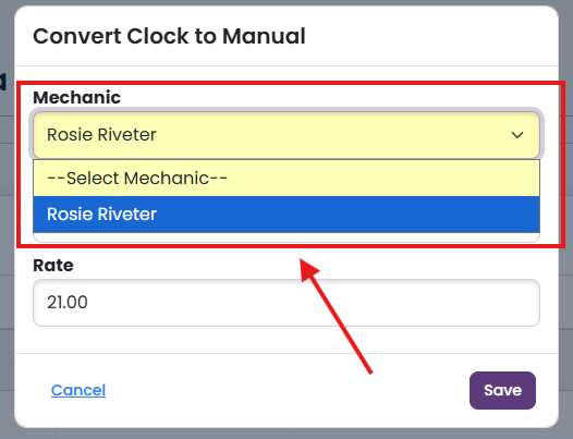 Select the Mechanic with Clock In/Out data that you would like to convert