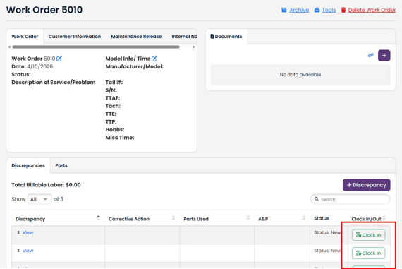 Once you have a Work Order built, if you are not clocked in elsewhere you will see a "Clock In" button on each Discrepancy row