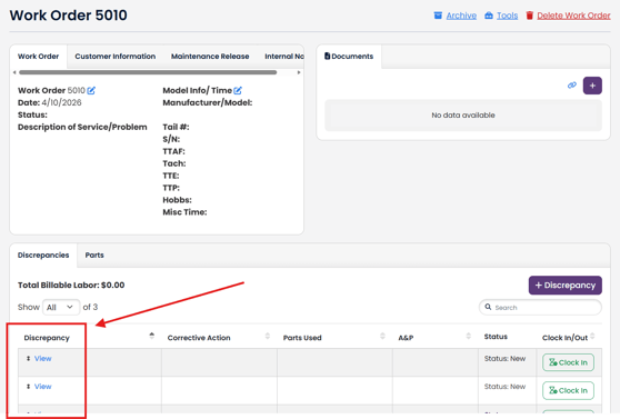 Once you have a Work Order built, view one of your Discrepancies.