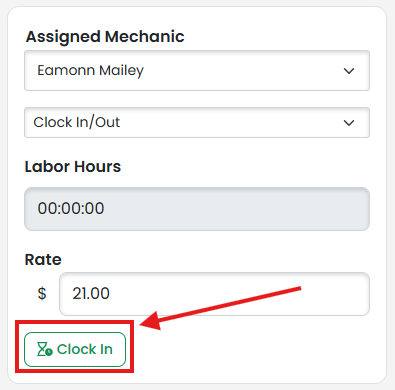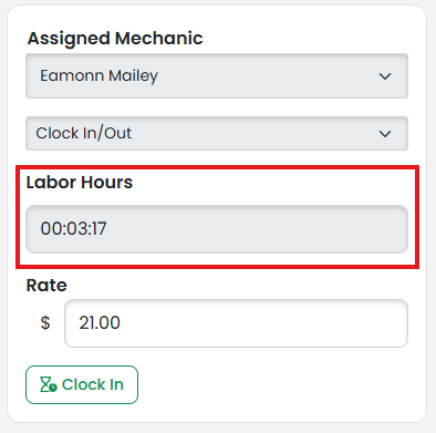 Labor Card: The card will default to Clock In/Out. The rate will default to the User's Default Hourly Labor Rate