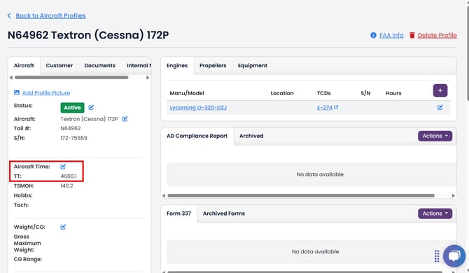 We recommend leveraging the Aircraft Profile to drive downstream workflows, particularly the filling in of reference data like aircraft time, engine time, and propeller times.