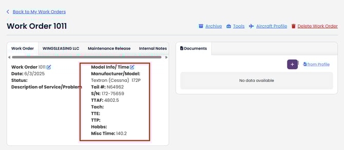 And on the next visit, the hours for the airframe were 4802.5, by simply updating the aircraft profile, your next work order would automatically pull in the time as such: