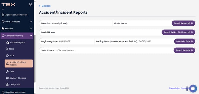Users can search this database by date range, state of incident, aircraft make or model, and Non-TCDS aircraft (i.e., non-certificated aircraft such as Experimental and homebuilt aircraft ("EAB").