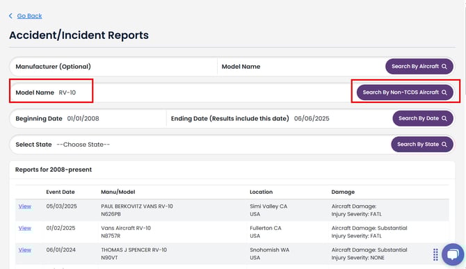 For example, if you want to search accidents for the Van's RV-10, click into the "Model Name" field on the second line, type "RV-10", then click the button "Search by Non-TCDS Aircraft".
