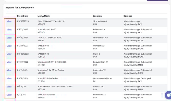 Reports will be listed below the search fields (sometimes the reports have multiple names for each type, i.e. "Van's RV-10" vs. "RV-10"):
