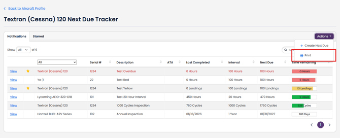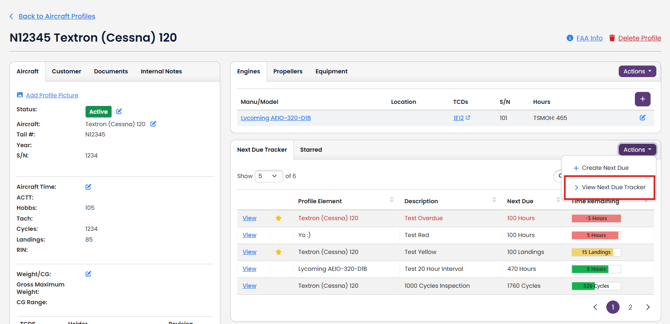 Click on the View Next Due Tracker action button on your Aircraft Profile