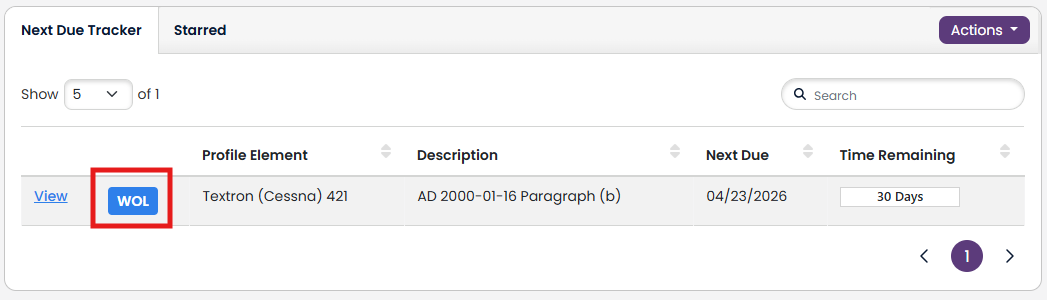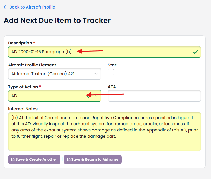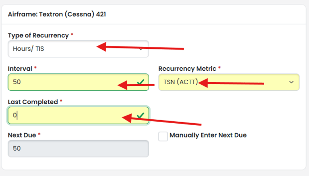Inside your Aircraft Profile, click "+ Create Next Due" in the Actions dropdown of the Next Due Tracker.