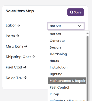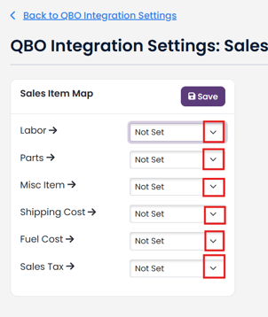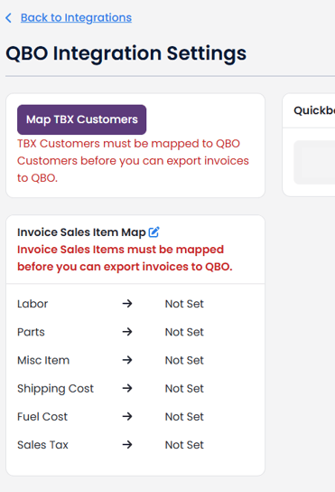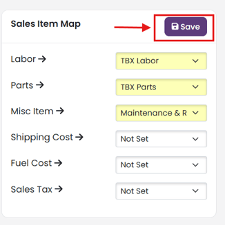 - TBX Items of Labor, Parts, Misc Items, Shipping Cost, Fuel Cost, and Sales Tax must be mapped to a Quickbooks Sales Item in order for invoices to be exported.