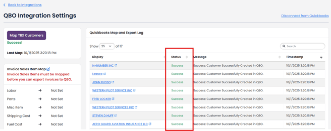 Once complete, TBX customers that mapped will appear in the Quickbooks Map and Export Log with either a green Success or a red Failure.