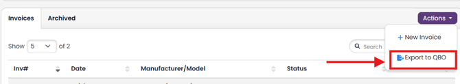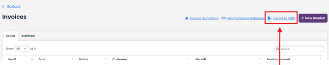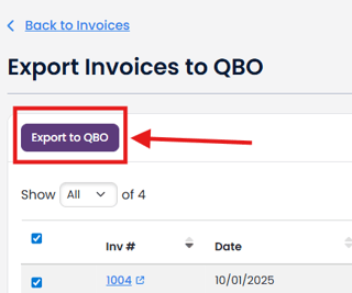 - Clicking on Invoices on the left hand navbar and clicking Export to QBO in the top right corner of the Invoices page.