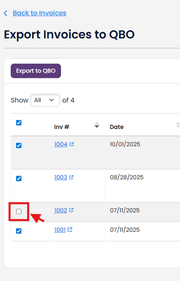 Checkboxes will only appear next to invoices that are eligible to be exported. Unselect any invoices you do not want exported.