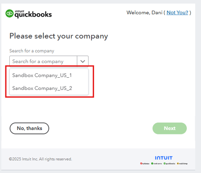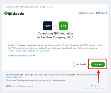 If you have more than one company associated with your QBO login credentials, you will be able to choose which company to connect with TBX.