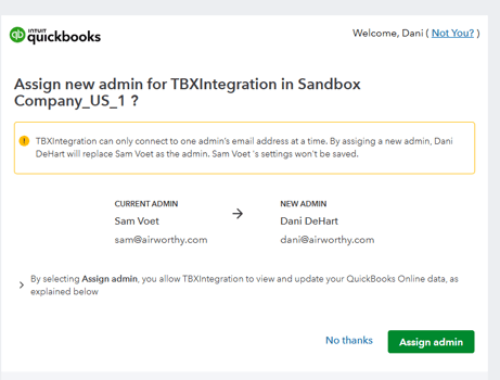 If you have more than one admin email address in QBO, you can only have one QBO account connected to TBX. You may see this request from QBO :