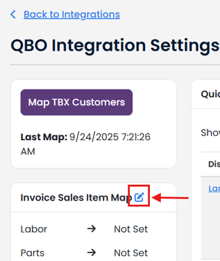 To map TBX Invoice Categories to your Quickbooks Online Sales Items, click the blue pencil icon in the Invoice Sales Item Map box on the QBO Integrations Setting page.
