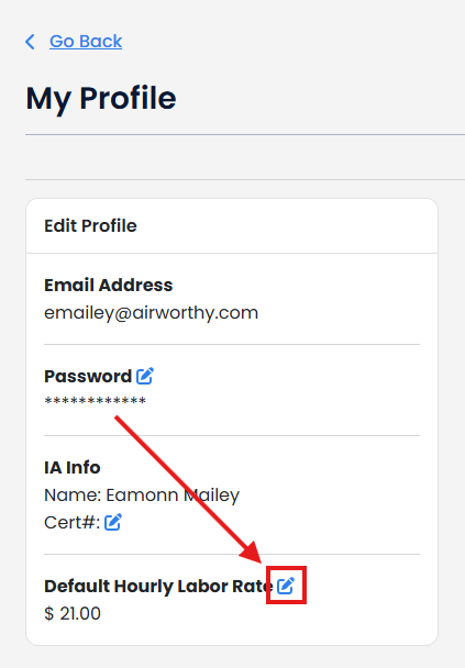 Click the blue pencil next to "Default Hourly Labor Rate"