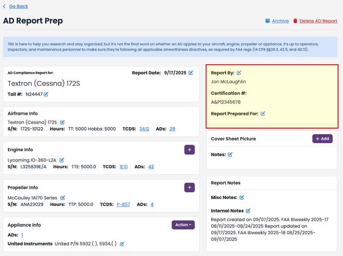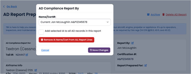 Users can update the name of the IA/A&P and the certificate numbers on all the lines of the AD Report Prep