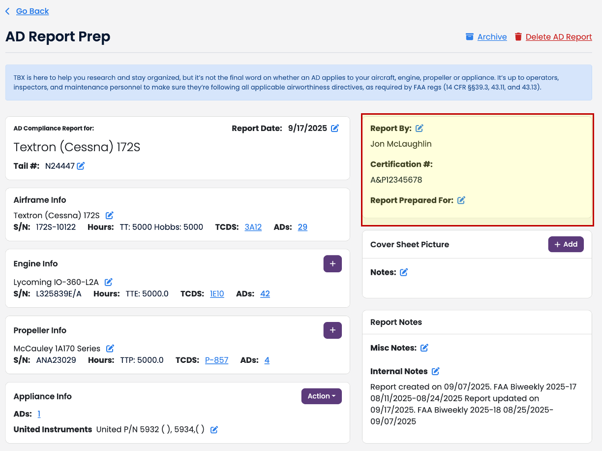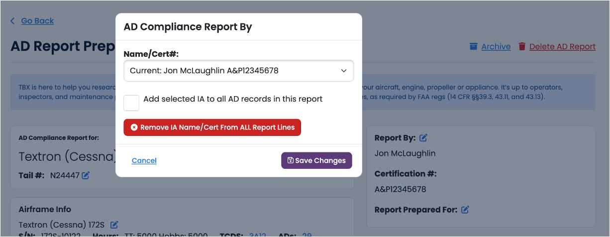 Users have the ability to update all the name of the IA/A&P and their certificate numbers within the AD Report Prep